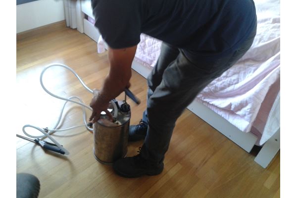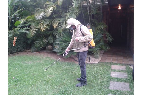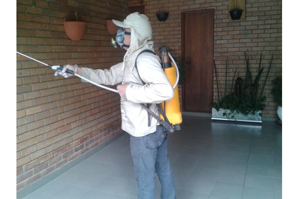 Pulverização: Consiste na aplicação de saneantes (venenos profissionais) com bomba manual, de alta pressão, nos locais que estão infestados, com produtos microencapsulados, de baixa toxidade e semi-inodoros.